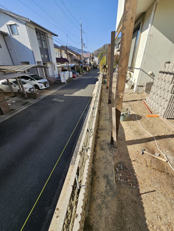 解体後は境界擁壁の上にアンカーを差込ブロックを積み足す作業からのスタートです。