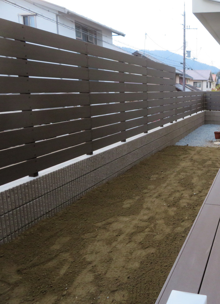 ブロックが積み上がり、その上にF&Fの木樹脂目隠しフェンス「ニコボード」を施しました。