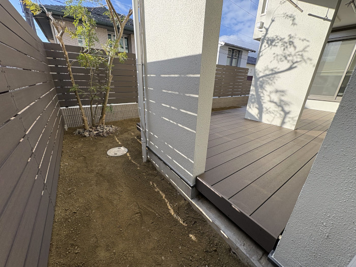 このダークウッド色は目隠しフェンスに使っているF&Fのニコボード ノアール色の