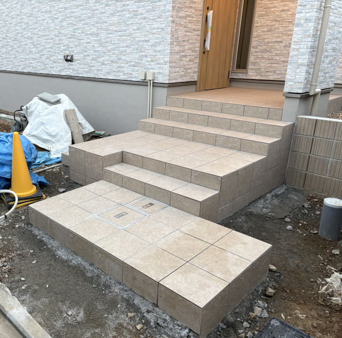 【ゼロホーム】新築外構 「階段アプローチタイル貼りと階段、掃き出し窓前ステップ」京都市西京区K様邸