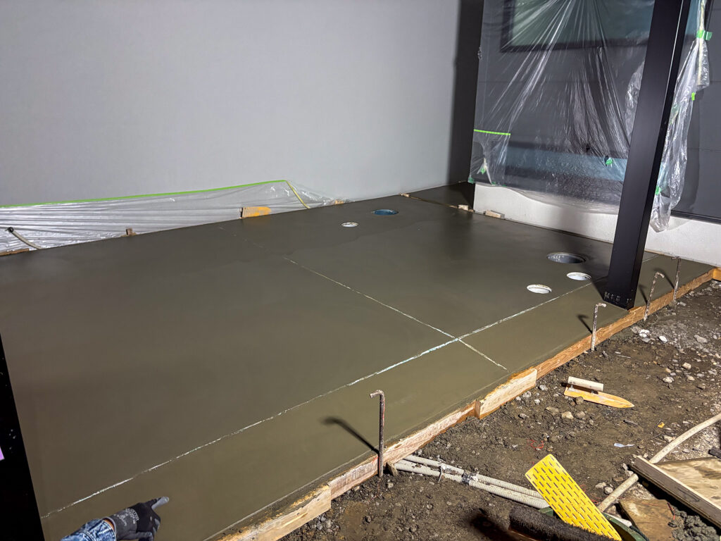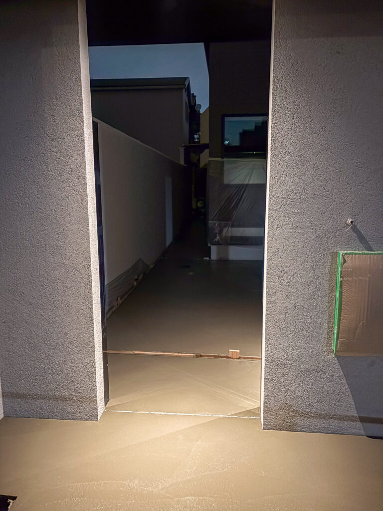 土間勾配が3Dに取れるのでこのような場合にも段差を作ることなく、水を流していけるのが土間コンクリートのいいところだと思います…!