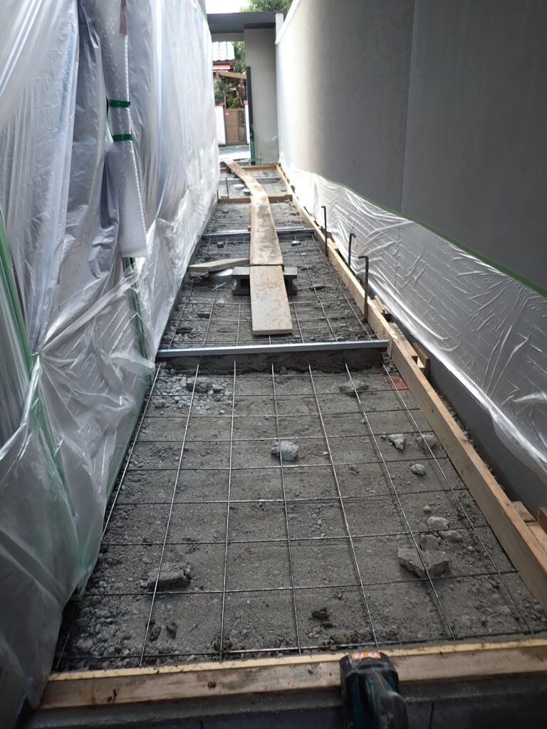 また、メッシュ筋は何かを下に入れて少し上げておかなければ土間コンクリートが食い込まず、全く意味をなさないので端に入れ込んで打設時にも上にあげながらやっていきます。