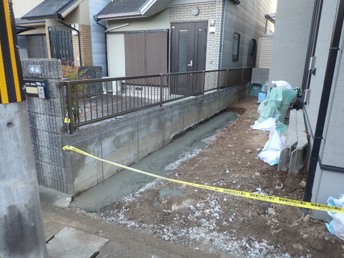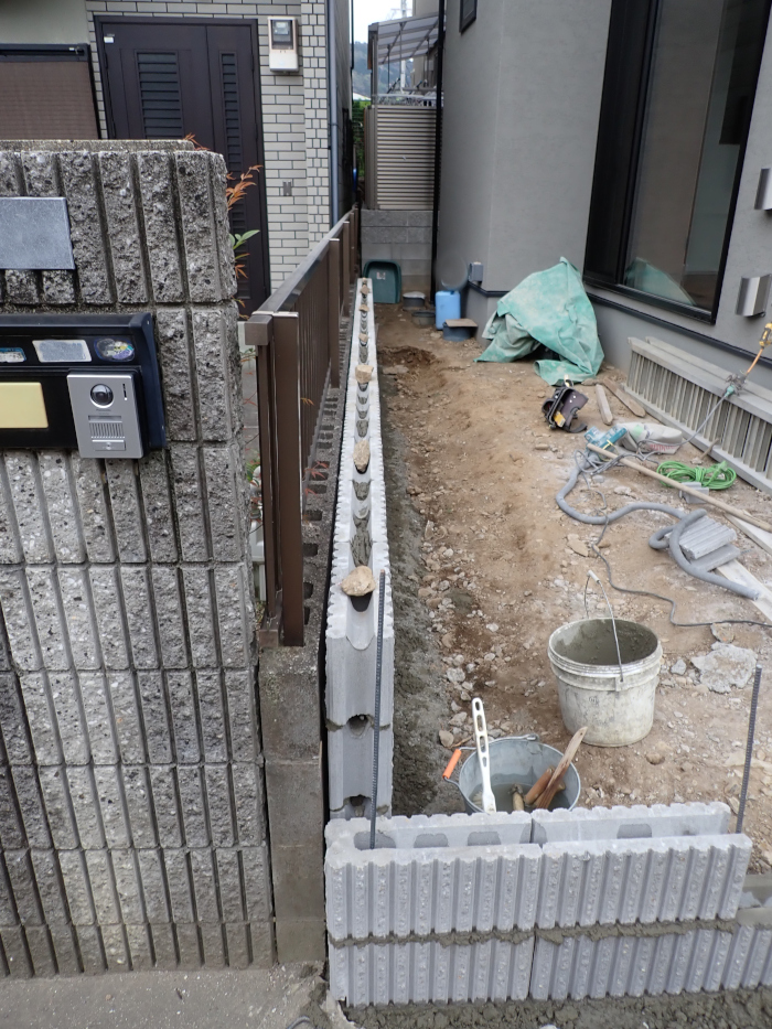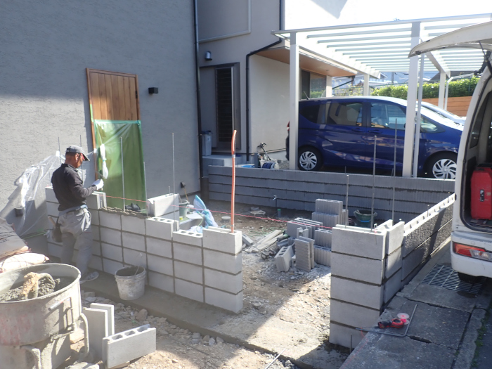境界と門塀のブロック積が進むとF様も外構の仕上がりイメージが少し見えて来たのではないでしょうか。