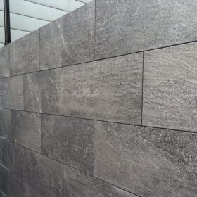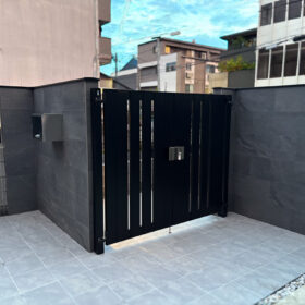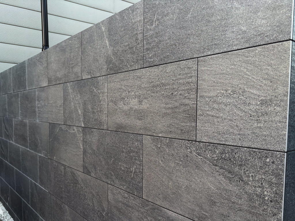 2m越えの門塀に自然石風のタイルをこしらえて高級感を。今風のシンプルモダンな空間にまとめました。